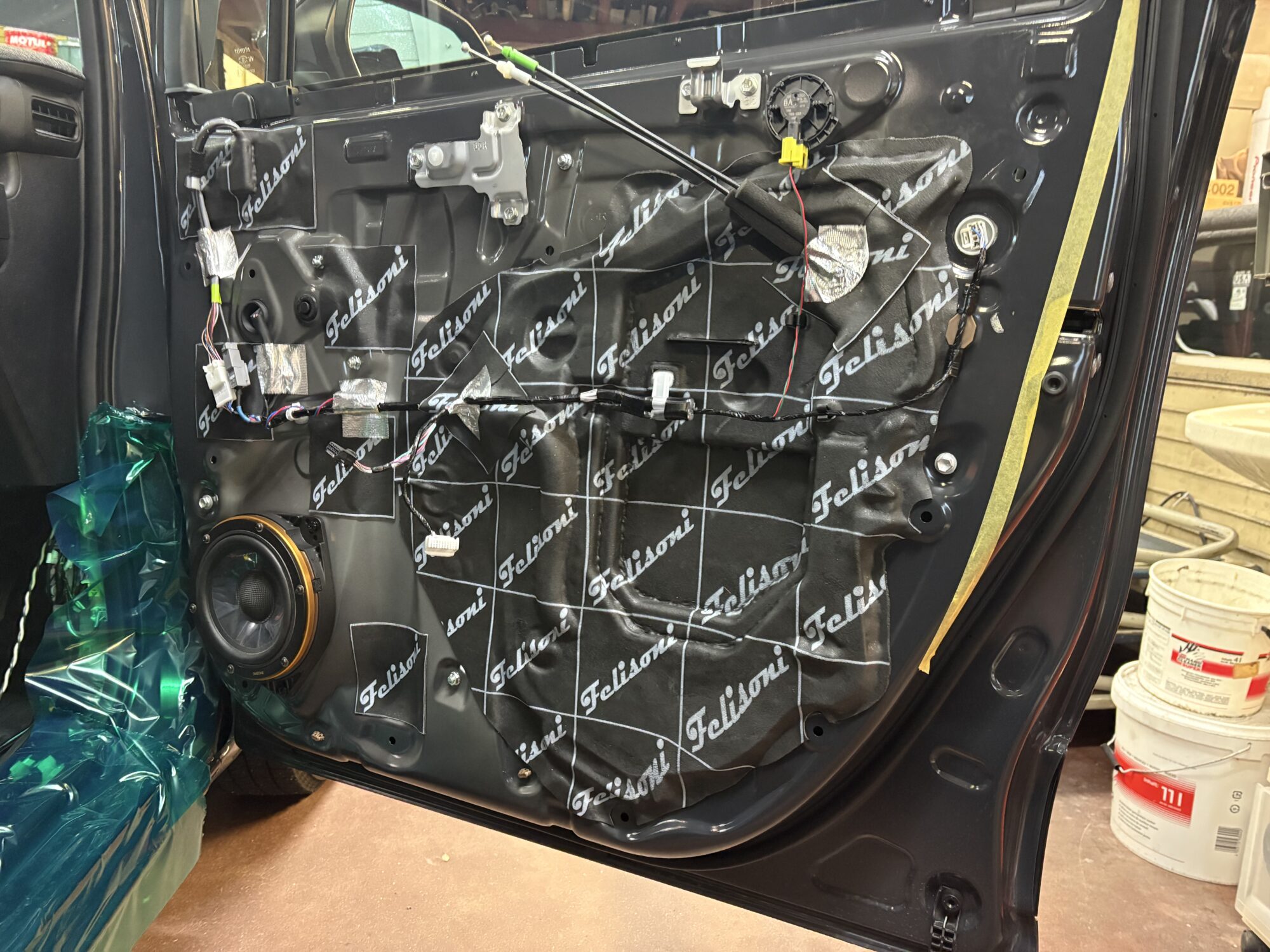 ドアウーファーはデッドニングを施工した上に、金属製インナーバッフルで強固にインストール。