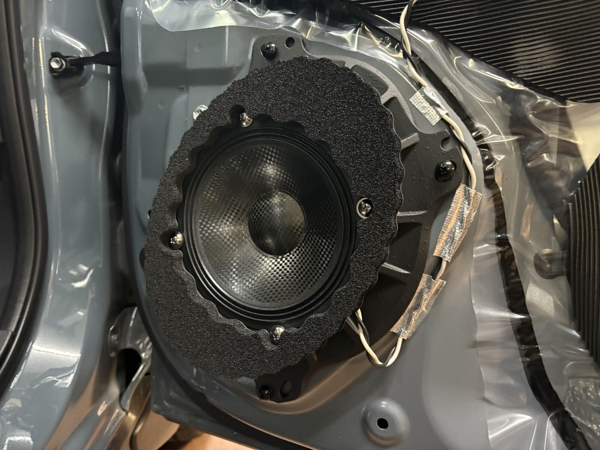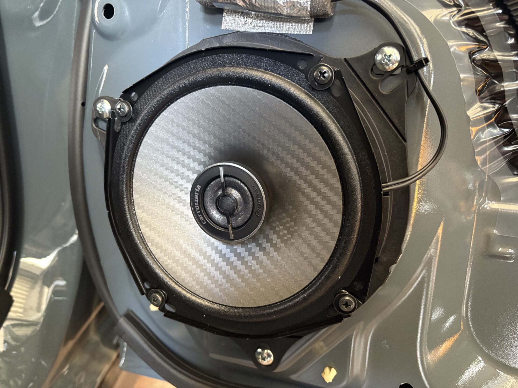 ドアスピーカーは金属インナーバッフルで強固に取り付けいたしました。