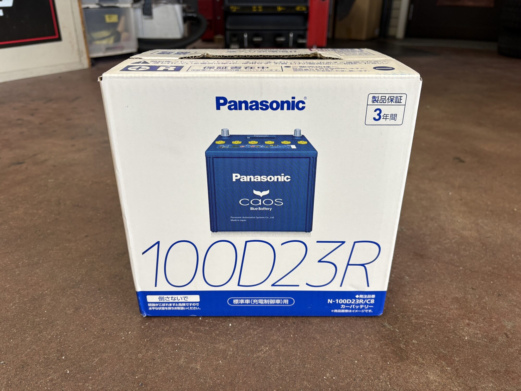 本日ご入庫の車には、当店でも人気の高性能バッテリーPanasonicのcaosに交換。